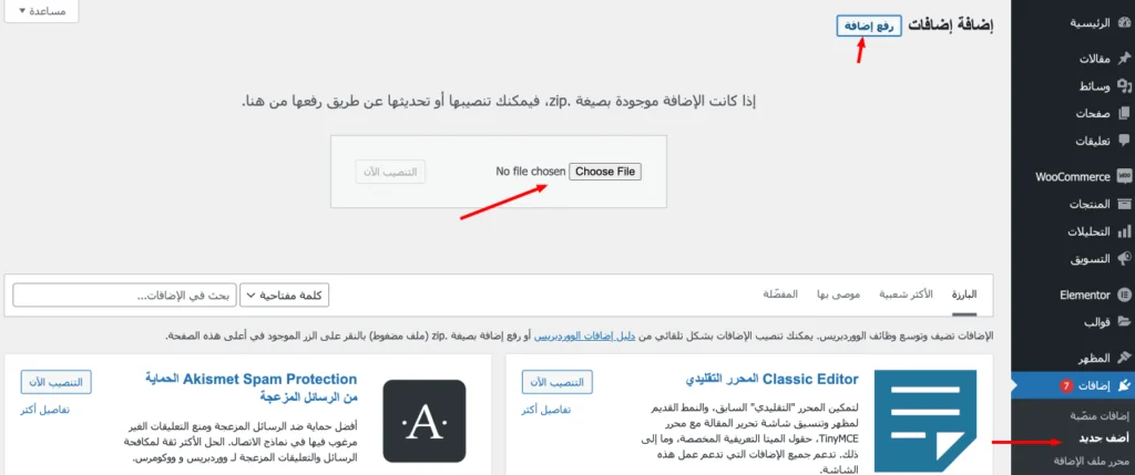 بعد تحميل الملف المضغوط الخاص بالإضافة woosheetsyncer.zip ، قم بالذهاب للوحة التحكم الخاصة بموقعك وقم بالآتي: