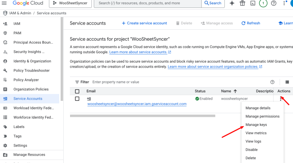 - اضغط على حساب الخدمة الذي أنشأته (اسمه أو بريده)